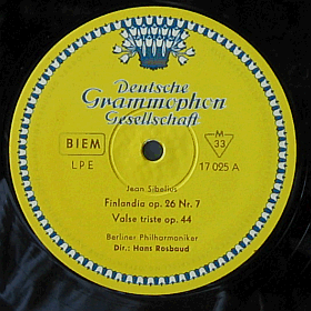 | Hans Rosbaud conduting Sibelius: "Finlandia op. 26, Nr. 7", "Valse Triste op 44", "The Swan of Tuonela op. 22" and "Bolero (Festivo) op 25, Nr. 3". Mono.