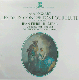 | Jean-Pierre Rampal plays Mozart's "Concerto for Flute and Orchestra No. 1 in G major, KV 313", "Concerto for Flute and Orchestra No. 2 in D major, KV 314" and "Andante for Flute and Orchestra in C major, KV 315". Later pressing. Stereo.