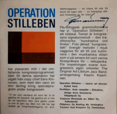 | Todellinen kummajainen, joka liittyy jollakin tavalla mainontaan ja mainosväen masinoimaan kongressiin, ovathan projetiin 'sekaantuneet' 1960 ja 1970 -lukujen mainosgurut Eero Kinnunen ja Kyösti Varis. Sen enempää en osaa Operation Stilleben -asiasta kertoa. Tällä yksipuolisella mainossinglellä (mitä se sitten mainostaakin) kongressin oma orkka The Original Ad-Libitum Jazz Band esittää mainosmusiikkiin erikoistuneen Kaarlo Kaartisen sovituksen Georg Malmstenin minulle tuntemattomaksi jäävästä rallista. Hyvää menoa, mainioita soittajia! Enpä ole tähän kiekkoon aiemmin törmännyt...