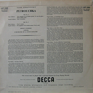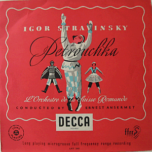 | Igor Stravinsky's "Petrouchka" performed by L'Orchestre de la Suisse Romande, conducted by Ernst Ansermet. Decca's original mono issue, with orange and gold (> lettering & logo) label.