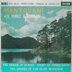 A world-famous British conductor / bandleader, born in 1905 in Venice Italy, moved to England already in 1912. Light classical/easy listening featuring Rawicz & Landauer on pianos. All three tracks - "The Legend of the Glass Mountain" (Rota), "The Story of Three Loves" (Rachmaninov) and "The Dream of Olwen" (Williams) - are taken from the 1958 album "Mantovani and His Orchestra with Rawicz & Landauer Play Music from the Films" (Decca LK 4154). Late 60's/early 70's mono pressing.