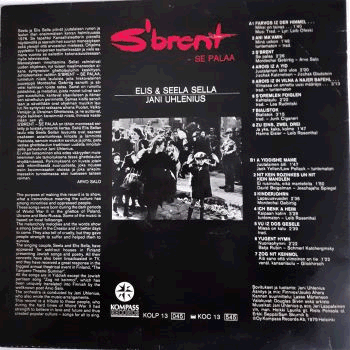 | "These songs were born during the dark periods of World War II in the ghettos of Poland, Ukraine and Belo-Russia. Some of the music is based on local folksongs... The singing couple, Seela and Elis Sella, have appeared for sold-out houses in Finland presenting Jewish songs and poetry... All the songs are in Yiddish except the Jewish partisan song "Zog nit keinmol", which has been uniquely translated into Finnish by the wellknown poet Arvo Salo.. This record is a tribute to those people, who during the hard times of Worl War II had strength to believe in love and future and thus created popular culture - songs for all to sing." (taken from the sleevenotes). This copy has an acknowledgement (> front cover, dated 2.8.79) by the Sellas to Sam Vanni, a famous Finnish painter, considered to be the pioneer of abstract art in Finland.