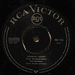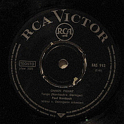 Mustat etiketti hopeateksteillä. Ylhäällä kaareva hopeinen RCA Victor -logo, sen alla pyöreä RCA-logo. B-puolen keskiössä pieni pintarepeämä.