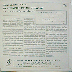 Beethoven's "Sonata No.29 in B flat major, Op. 106" ("Hammerklavier") and "Sonata No. 27 in E minor, Op. 90" performed by Hans Richter-Haaser. Mono issue, released in stereo as SAX 2407.
