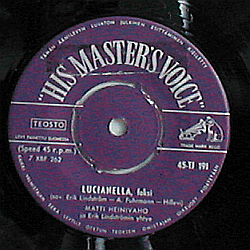 Violetti etiketti hopeateksteillä. Ylhäällä kaareva hopeinen His Master's Voice -logo. A-puolella kevyt teipin poisto- / liimajälki.