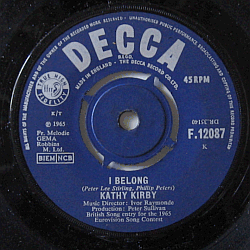 A highly popular English pop singer in the 1960s, born Kathleen O'Rourke in 1938 in Ilford, Essex. "I Belong" was one of her big hits and also the entry of UK for the Eurovision Song Contest 1965 (came 2nd). Her 8th or so UK single.