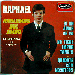 A world-famous Spanish singer and actor, born Don Rafael Martos Sánchez in 1943 in Linares. 1967 Spanish entry for the Eurovision Song Contest (became 6th) plus three other Spanish language songs: "Si un amore se va", "No tiene impor tancia" and "Quedate con nosotros". French issue.