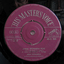 Violetti etiketti hopeateksteillä. Ylhäällä kaareva hopeinen His Master's Voice -logo. Kevyitä likajälkiä B-puolella.