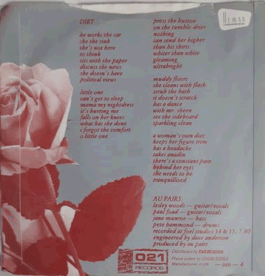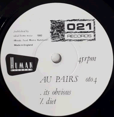 | Side A: White Au Pairs picture label. Side AA. White label with track listing for both sides plus other info + black & white 021 Records and Human Records logos. |  | Semi-matt top-opening picture sleeve. Light surface wear on front. One tiny edge tear on back (> top > right). Light creases along the edges (> mainly > front > top). Slightly worn / creased / bent corners. |