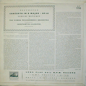 | Beethoven's "Violin Concerto in D major, op. 61" performed by Yehudi Menuhin with the Vienna Philharmonic Orchestra, conducted by Constantin Silvesti. Mono issue, released in stereo as ASD 377.