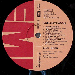| Punaruskea etiketti, jossa vasemmalla iso punainen EMI:n pystylogo. |  | Kiiltävät kannet. Etupuolella tarran / hintalapun poistosta syntynyt pintarepeämä (> vasemmalla > ylhäällä). Molemmin puolin kevyttä pintakulumaa (> alhaalla > keskellä > lähinnä takana). Reunoissa vähäistä kulumaa ja melko runsaasti pikkuryppyjä. Kevyttä kulumaa kulmissa. |