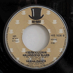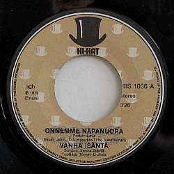| Vaaleanruskea etiketti, pohjalla useita pieniä valkoisia silinterihattuja. Musta Hi-Hatin kuvalogo ylhäällä. Sattuvat kuitenkin olemaan Vanhan Isännän "Olemme napanuora / Kuuskytluvun kauansoiva blues" -sinkun (HIS 1036) etiketit. Kumpaankin puolta on korjailtu kuulakynällä. |  | Kuvakannet puuttuu. |