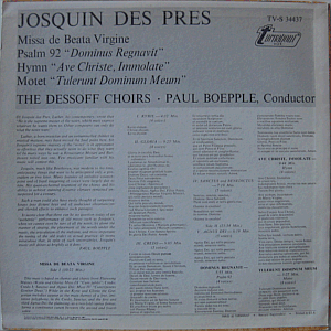 | Josquin Deprez' "Missa de Beata Virgine", "Psalm 92: Dominus Regnavit"), "Hymn: Ave Christe, Immolate") and "Motet: Tulerunt Dominum Meum", performed by The Dessoff Choirs conducted by Paul Boepple. 1970s edition, I should think.