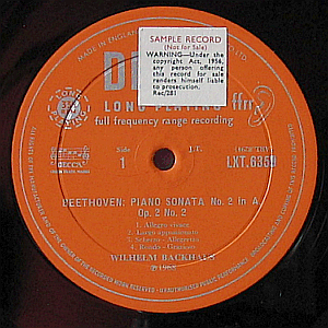| Beethoven's "Sonata No. 2 in A Major, Op. 2, No. 2", "Sonata No. 10 in G Major. Op. 14, No. 2" and "Sonata No. 19 in G Minor, Op. 49, No. 1", played by Wilhelm Backhaus (piano). Mono issue, sample record.