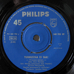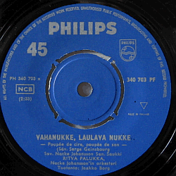 A relatively unknown Finnish female singer, born in 1946 in Kannus. Side A is a Finnish language cover version of the 1965 Eurovision Song Contest winning song "Poupée de cire, poupée de son", performed by France Gall for Luxembourg.