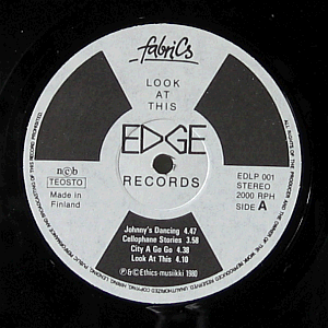 Mustavalkoinen 'auton ratti'-etiketti. Keskellä musta Edge Records -logo.