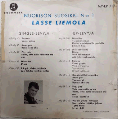 Helsingissä 1937 syntynyt 1950-luvun lopun ja seuraavan vuosikymmenen alun teini-idoli. Neljän biisin - "Pik-pik-pikku tyttösein" / "Sun tahdon tähtiin johtaa" // "Tyttökulta, herää jo" / "Living Doll" - EP, jolla Liemolaa säestää Pentti Lasasen yhtye. Taitaa olla Lassen järjestyksessä viides oma EP-levy.