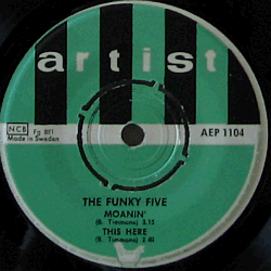 A short-lived Swedish jazz quintet featuring Lars Bagge (piano), Rune Larsson (guitar), Kjell Norlén (guitar), Claes Lindroth (bass) and Egil Johans(s)en / Nils-Erik Svensson (drums). 7-inch 45 rpm EP with four tracks: "Moanin'" / "This Here" // "Amen" / "So What". Their first and only (?) recordings from October 1961. Very rare these days!