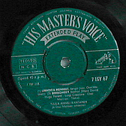 Vihreä etiketti hopeateksteillä. Ylhäällä kaareva hopeinen His Master's Voice -tekstilogo, "koira ja grammari" -kuvalogo oikealla.