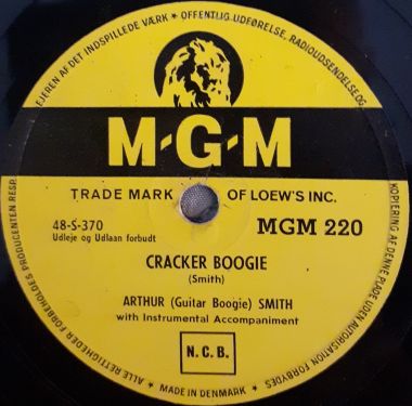| Vuonna 1921 Etelä-Carolinan Clintonissa syntynyt amerikkalainen muusikko, säveltäjä, levytuottaja ja musiikkiviihteen monitoimimies, legendaarisen "Guitar Boogie" -biisin tekijä. A-puolen esittäjäksi on merkitty Arthur (Guitar Boogie) Smith and his Crackerjacks, levytysvuosi lienee 1949, tämä tanskalaispainos 50-luvun alkupuolelta. Taitaa olla artistin järjestyksessä kolmas sinkku.