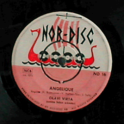 Valkoinen ja pinkki etiketti. Yläosassa iso punamustapinkki Nor-Discin "viikinkilaiva" -kuvalogo.