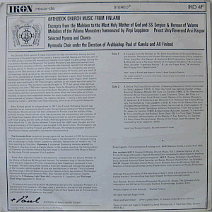 | |  | Folded lyric sheet (in English), Finnish language info sheet, Archbishop Paul's letter 'An appeal for the reconstruction of Valamo monastry' (in English, ) and Ikon Records 'contact coupon' enclosed. |
