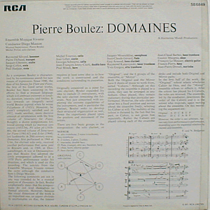 "Domaines" by Pierre Boulez, performed by Ensemble Musique Vivante, featuring Michel Portal on solo clarinet. Conducted by Diego Masson, musical supervision by Pierre Boulez. UK issue of Harmondia Mundi HM 930 (France 1970).