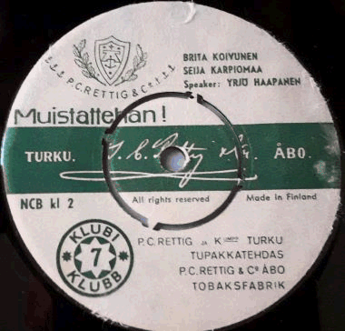 Valkoinen etiketti tummanvihrellä tekstillä ja keskiraidalla. Ylhäällä P.C Rettig & Co ja alhaalla Klubi 7 -logot vihreällä. Kevyttä kulumaa reunoissa molemmin puolin.