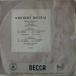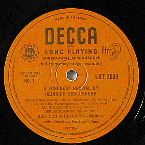 Schubert's "Schwanengesang", "Die Winterreise" and "Die Schöne Müllerin" sung by Heinrich Schlusnus, accompanied by Sebastian Peschko. Decca's orange & gold (> lettering & logo) label mono issue.