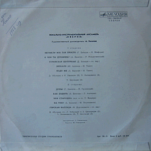 A renowned Georgian pop / rock / folklore group, formed in 1968 by Alexander Basilaya. Their 2nd album, manufactured in the Tbilisi pressing plant.