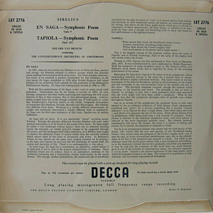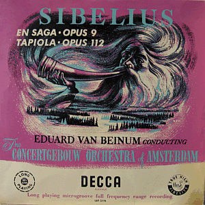 | "En Saga" and Tapiola" - two symphonic poems - by Jean Sibelius, performed by the Concertgebouw Orchestra of Amsterdam conducted by Eduard van Beinum. 2nd label mono issue from 1955 or 1956, I should think. Not available in Decca's SXL stereo series.