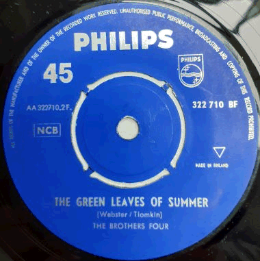 | One of the longest surviving groups of the late fifties / early sixties folk revival, formed in Seattle, Washington in 1958. Finnish issue of Philips PB 1009 / 322564 BF (England 1959), "The Green Leaves of Summer" replacing "East Virginia" on side B. Their smash hit 2nd single, released in January 1960 in the USA.