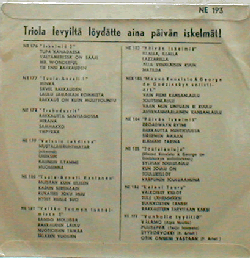 | Valkoinen etiketti, jonka keskellä vaakajono vaaleanpinkkejä vinoneliöitä. Musta Triolan-kaarilogo keskiön päällä. |  | Laminoidut kuvakannet, takana päällekäännetyt saumat. Takakannessa laminointi on irronnut pieneltä alueelta. Hieman ryppyiset. Yksi taittunut kulma (> vasemmalla ylhäällä). |