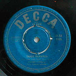 Tummansininen etiketti hopeateksteillä. Ylhäällä kaareva hopeinen Decca-logo.