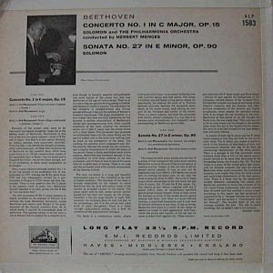 Beethoven's "Concerto No. 1 in C major, Op. 15" (side A) and "Sonata No. 27 in E minor, Op. 90" (side B),m performed by Solomon (Cutner) with (side A) the Philharmonia Orchestra conducted by Herbert Menges. Original UK mono issue.