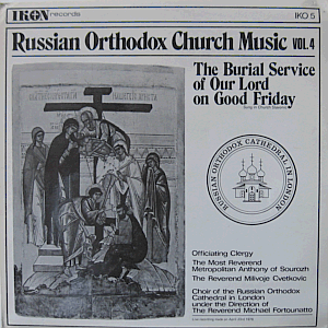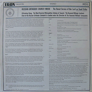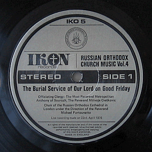 | Silver labels with black rim. Black Ikon logo above the centre hole (> left), with circular Russian Orthodox Cathedral in London emblem at the top. |  | Laminated (> front only) single cover. Some light dirt marks on back. Light creases along the edges. Some corner wear, two of the corners (> top > left & right) being also creased / bent. |