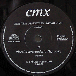 | A-puolella musta pohja valkoisella tekstillä, B-sivulla mustavalkoinen 'äijät'-etiketti. |  | Puolimatat kuvakannet. Takana hieman kirjoitusta (> edellisen omistajan etunimi ja hankintapäivämäärä >vasemmalla > alhaalla > hyvin pienellä). Yksi karvan verran taittunut kulma (> vasemmalla > ylhäällä). |