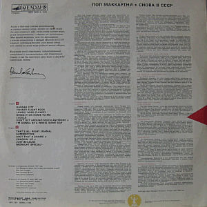| Red labels. Black Melodiya 'city silhouette' picture logo at the top. Manufacturing time code 'rocT 5289-88'. |  | Semi-glossy single cover, white on back. Small water damage stain on front (> bottom > left). Light dirt marks on each side. Light wear and some tiny creases along the edges. Light corner wear, one of the corners (> top > right) being also slightly bent. Front cover: Gold star at the top > right, black MPL picture logo at the bottom > right. |