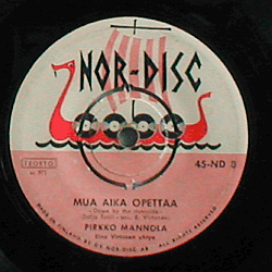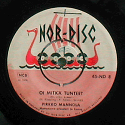 | Pinkki (> alaosa) ja valkoinen etiketti. Yläosassa iso punamusta Nor-Discin viikinkilaivalogo. Kevyitä likajälkiä molemmin puolin. A-sivun keskiössä hieman kirjoitusta (> pari kuulankynäjälkeä). |  | |