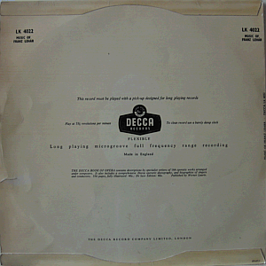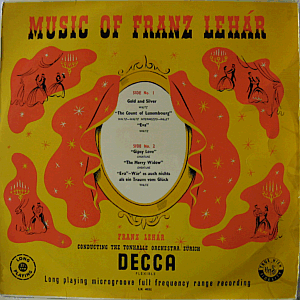 | Franz Lehár conducting in 1947 overtures and waltzes from his operettas with the Tonhalle Orchestra, Zürich. These recordings were made by English Decca for a series of 78 rpm records. The recordings had remarkable sound for their time because they were made using Decca's Full Frequency Range Recording process, one of the first commercial high fidelity techniques. Released for the first time on vinyl in the early 1950s. Mono.