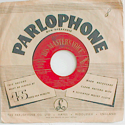 | Red labels with gold print. Curved gold His Master's Voice logo above the centre hole. Light dirt stain on side A. |  | Company sleeve. Some writing on front. A bit creased. |