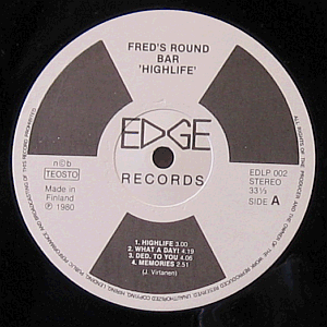 Mustavalkoinen 'nauhakela'-etiketti. Keskellä musta Edge Records -logo.