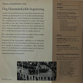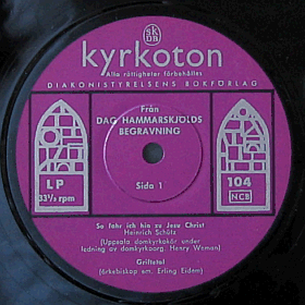 | Original sound recording from Dag Hammarskjöld's - the second Secretary-General of the United Nations - funeral September 29th, 1961 in Upssala Cathedral, Sweden. Recording made by the Swedish Broadcasting Company. Mono.