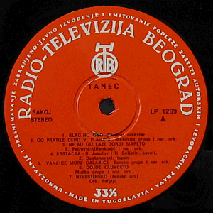 Red labels. White RTB picture logo at the top, with curved white Radio-Televizija Beograd text above.Glossy single cover. A few small 'dirt' marks (> middle) and one edge tear (> right > middle) on front. Some writing (> top > right) and a few light dirt marks on back. Light wear and small creases along the edges. Slightly worn corners.