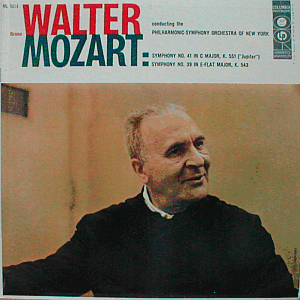 Mozart's "Symphony No. 41 in C Major, K. 551" ("Jupiter") and "Symphony No. 39 in E-flat Major, K. 543", performed by the Philharmonic-Symphony Orchestra of New York, conducted by Bruno Walter. The back cover reads 'Mozart Bicentennial Commemorative Issue 1956 - 1956'. Mono.