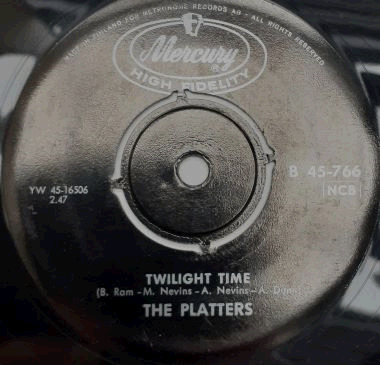 | A legendary American vocals group, formed in 1952 in Los Angeles, Californbia, one of the most successful vocal groups of the early rock and roll era. "Twilight Time" has been recorded by numerous groups over the years. However, the best-known version of the song was recorded by The Platters, ans became a No. 1 hit on both the pop singles and R&B best sellers lists in 1958 in the United States. Finnish issue of Mercury 71289X45 (USA, 1958), almost identical to the Swedish issue but five times rarer!