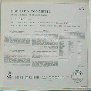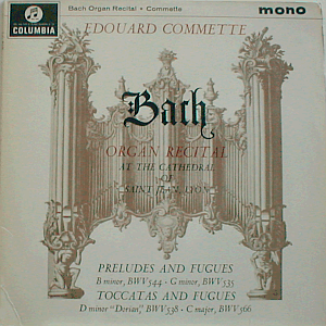 Johann Sebastian Bach's "Preludes and Fugues: B minor BWV 544 & G minor BWV 535" and "Toccatas and Fugues: D minor 'Dorian' BWV 538 & C major BWV 566", performed by Edouard Commette at the Cathedral of St. Jean, Lyon, France. Mono issue.