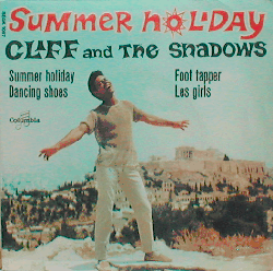 | One of the most popular singers of all time in the UK, born Harry Rodger Webb in 1940 in Lucknow, India. Four tracks taken from the soundtrack album "Summer Holiday" (Columbia 33SX 1742, England 1963). Danish mono issue of "Hits from Summer Holiday" (Columbia SEG 8250, England 1963). However, "The Next Time" and "Bachelor Boy" have been replaced with "Foot Tapper" and "Les Girls", both performed by the Shadows alone. Also the front cover design (as well as the record title) is a bit different to UK one. Black and white back cover adverising three of their singles.