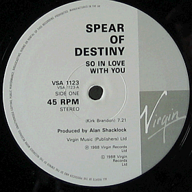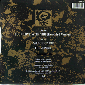 A popular English post punk band, formed in 1983 in London by Kirk Brandon and Stan Stammers. 10 inch 45 rpm EP / single with three tracks: "So in Love with You (Extended Version)" // "March or Die" / "The Jungle". The front cover reads: 'Limited edition individually numbered'. Number 2522.
