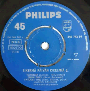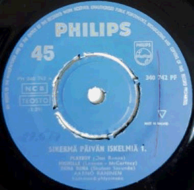 | Tummansininben etiketti hopeateksteillä. Ylhäällä Philipsin hopealogot. A-puolella hieman kirjoitusta (> päivämäärä) ja outo punainen pystyviiva (> oikealla). |  | Levy-yhtiön muovipussi. Mahtaako olla alkuperäinen... |